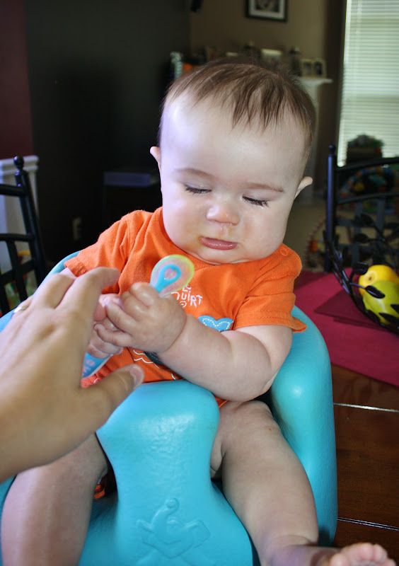 - Whole Grain Cereal - Mom wasn't sure he was ready for real food, but the way he took down the whole first bowl of cereal, grabbed the spoon, and looked at her like 'where's the rest, lady?', she knew that she had been mistaken and that he was ready to dive in. Now, we just need to keep his thumb out of his mouth and his eyes off of the fish tank while he dines. We just can't help sharing lots of pictures from that very first food experience.